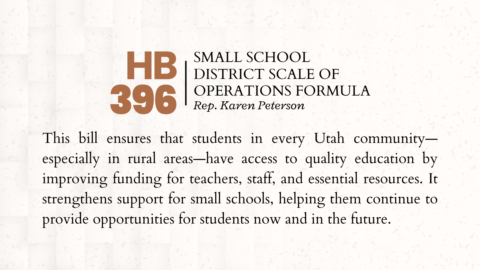 Every child in Utah, no matter where they live, deserves access to a high-quality education. This session, we worked closely with rural communities to ensure that small schools have the funding and resources they need to provide excellent teachers, principals, bus drivers, and support staff. By strengthening the funding formula, we are helping rural schools continue opening doors of opportunity for students now and in the future. Investing in rural education means investing in the success of every Utah student, in every corner of our state.
